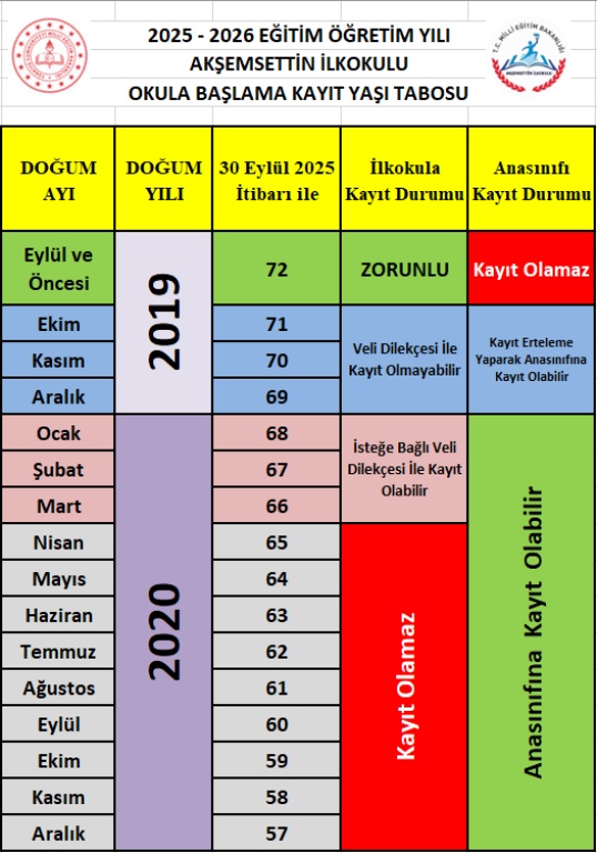 Okul Kayıt Yaş Hesaplama Tablosu için tıklayınız.
