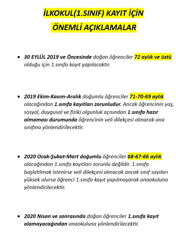 5. 30 Eylül 2019 ve öncesi doğan çocuklarımızın kayıtları zorunlu olup bu tarihten sonra doğan çocuklar anaokuluna yönlendirilecektir.