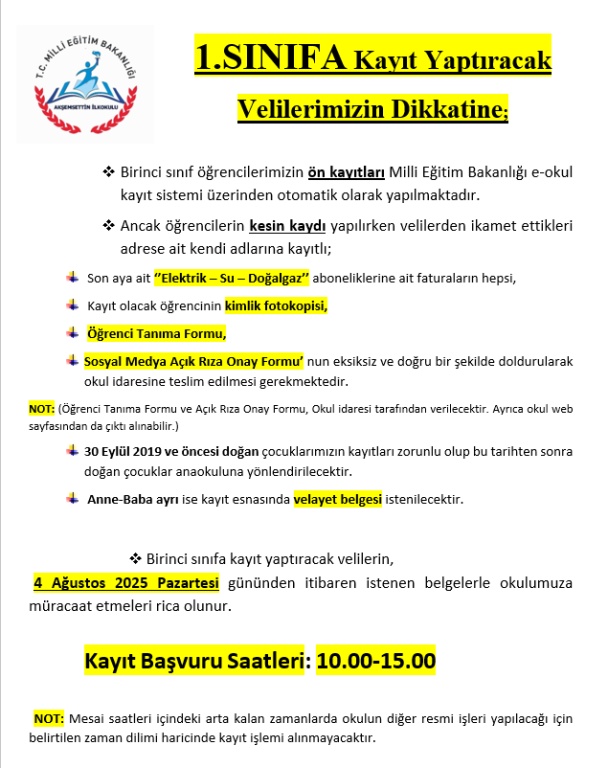 4 Ağustos 2025 Pazartesi gününden itibaren istenen belgelerle okulumuza müracaat etmeleri rica olunur.